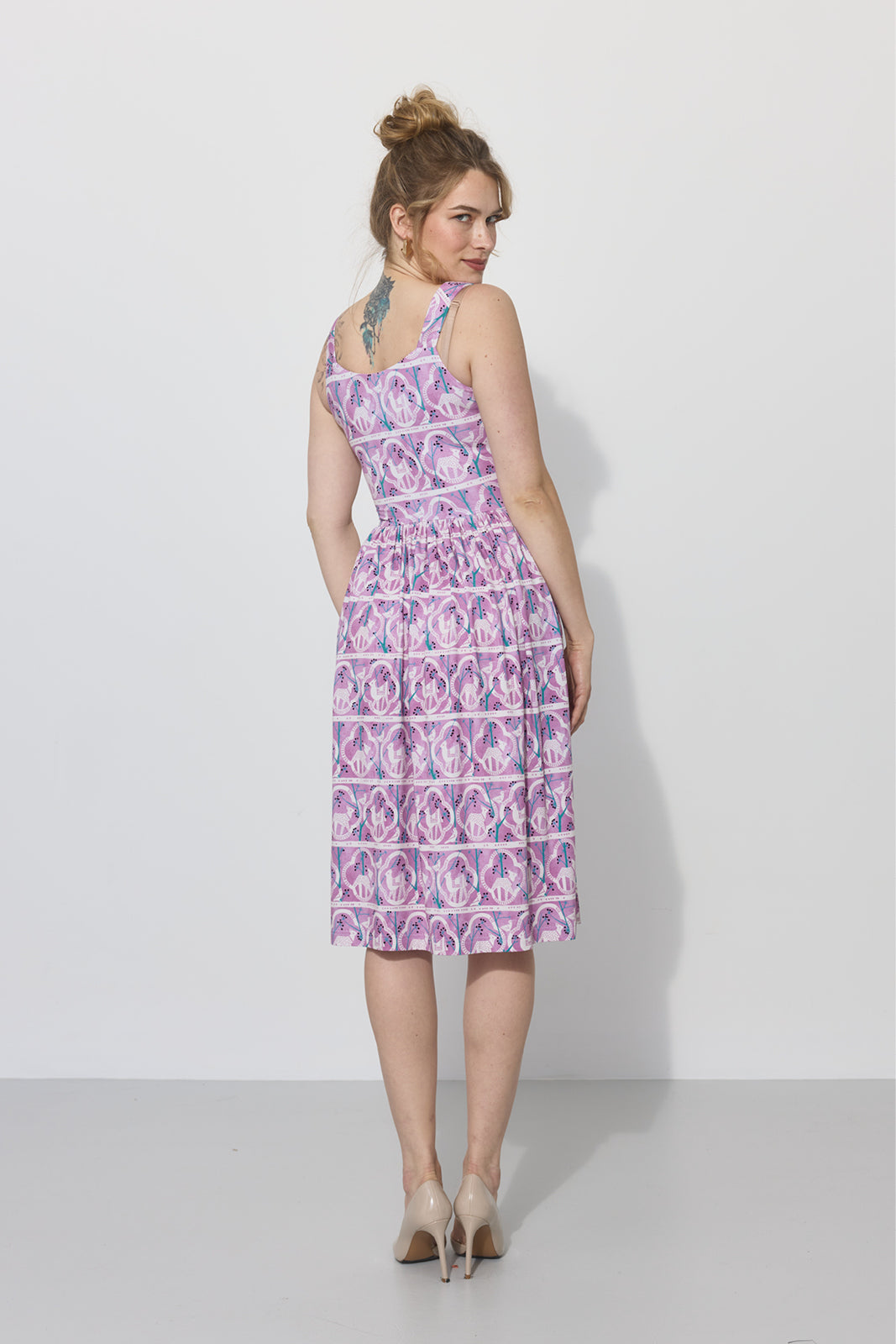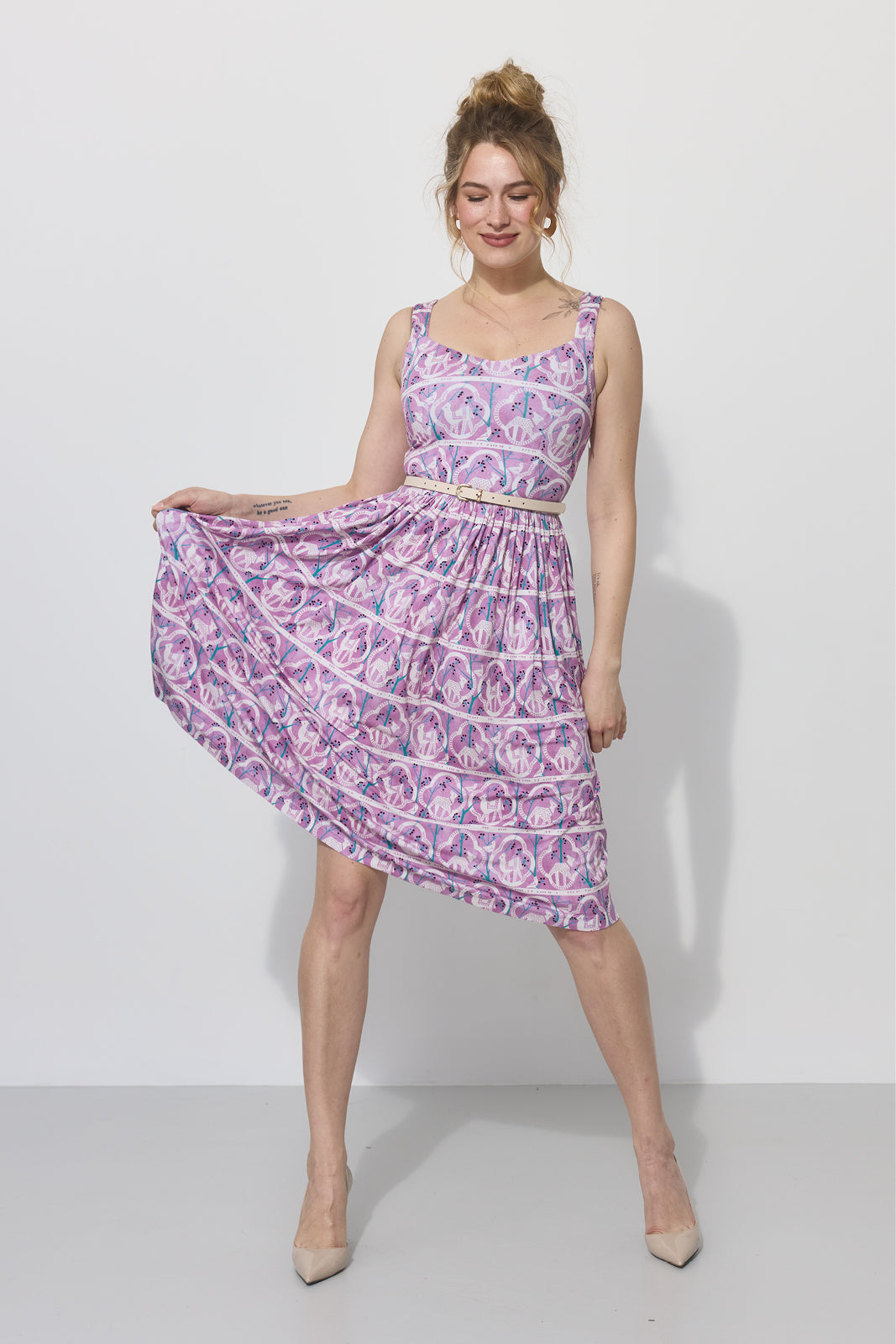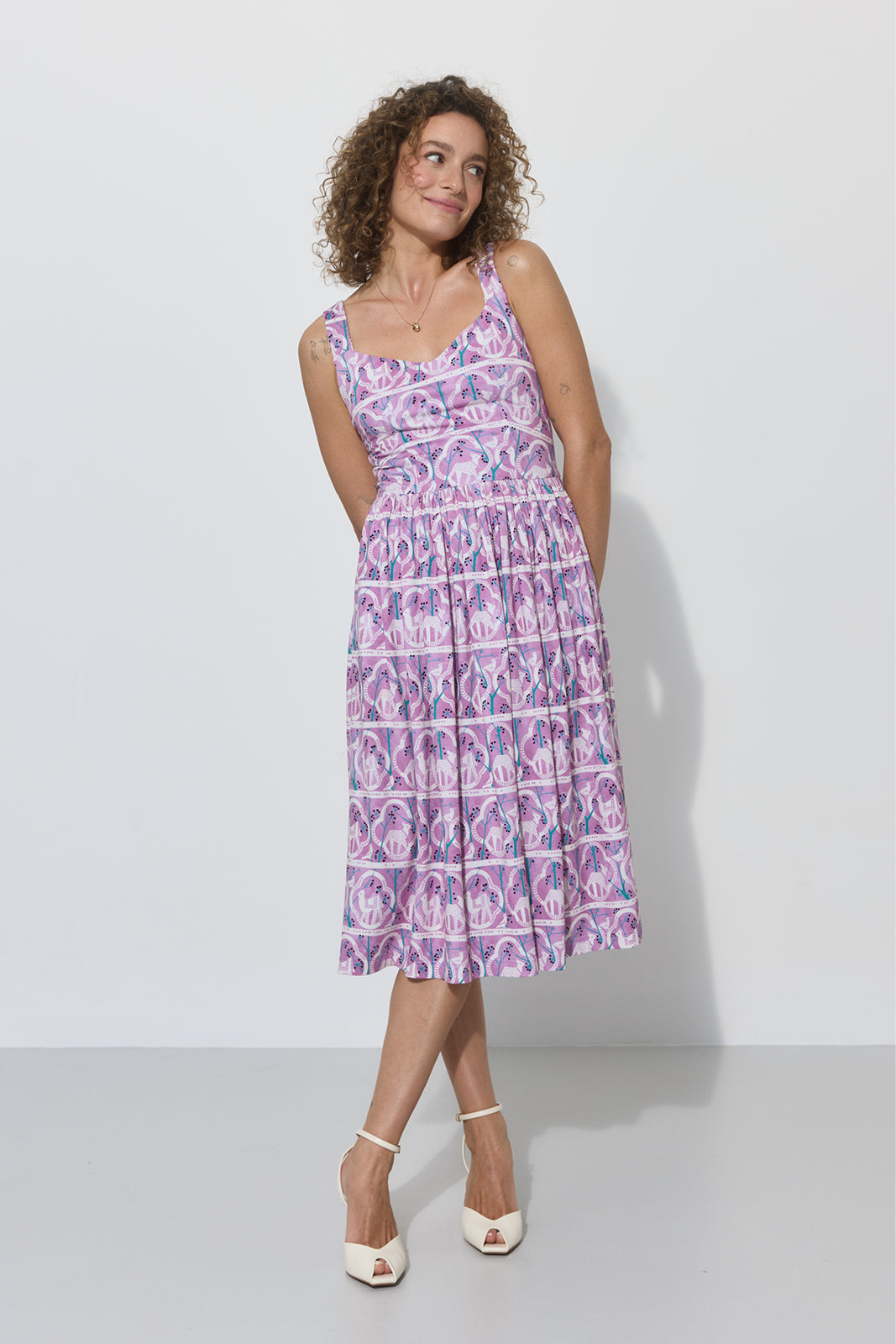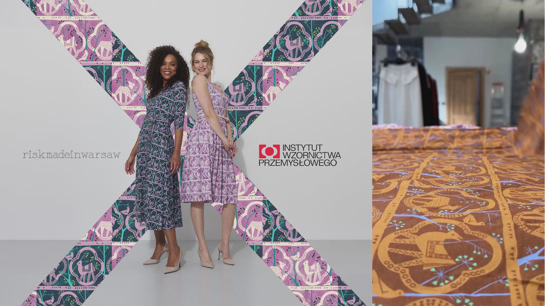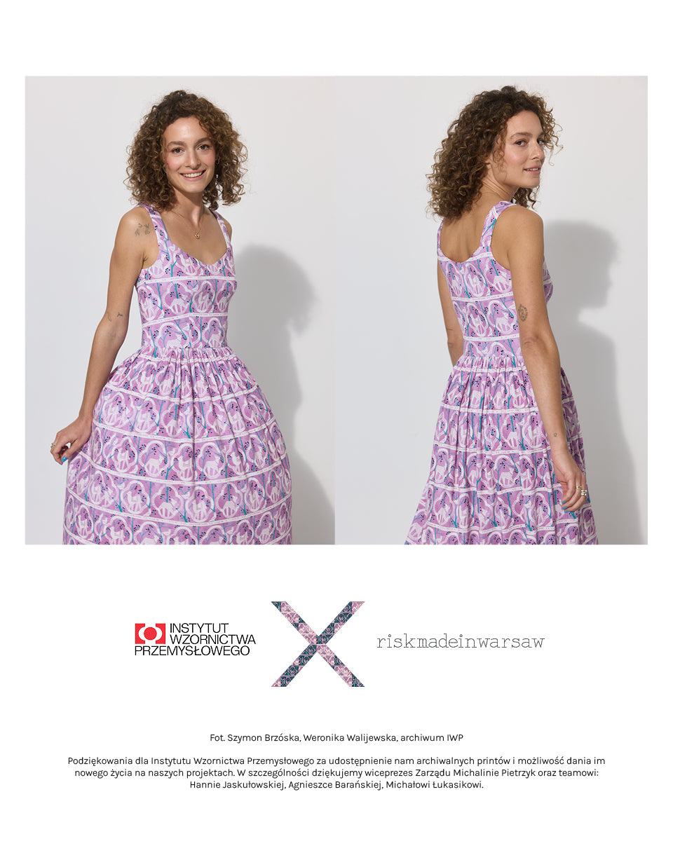 Co za print na niej widzisz? Powstał w 1955 roku. Zaprojektowała go Danuta Paprowicz-Michno dla Instytutu Wzornictwa Przemysłowego, inspirując się wizytą w zoo i rysiami, które wtedy podziwiała z bliska. Po latach znaleźliśmy go w archiwach IWP. Z artystą Marcinem Franczakiem odtworzyliśmy go z małego skrawka materiału i nadaliśmy nowe kolory – takie, które pasują do teraz, rozświetlają cerę i sprawią, że będziesz chciała nosić tę sukienkę non stop.