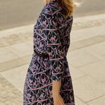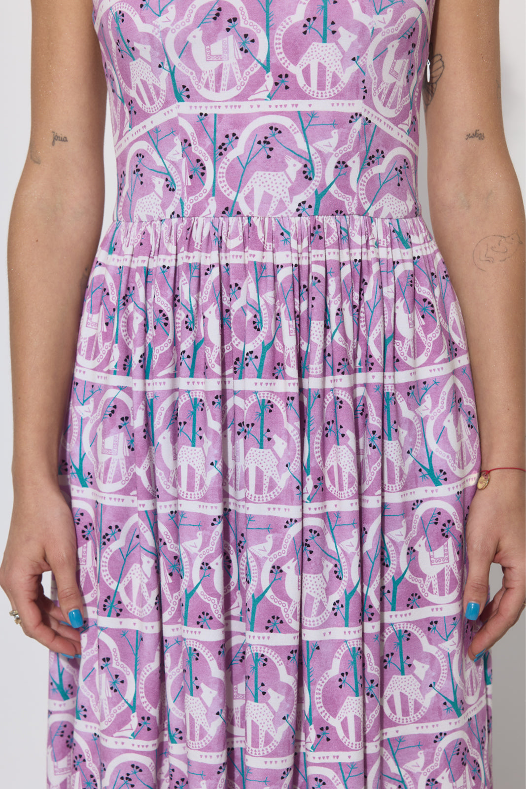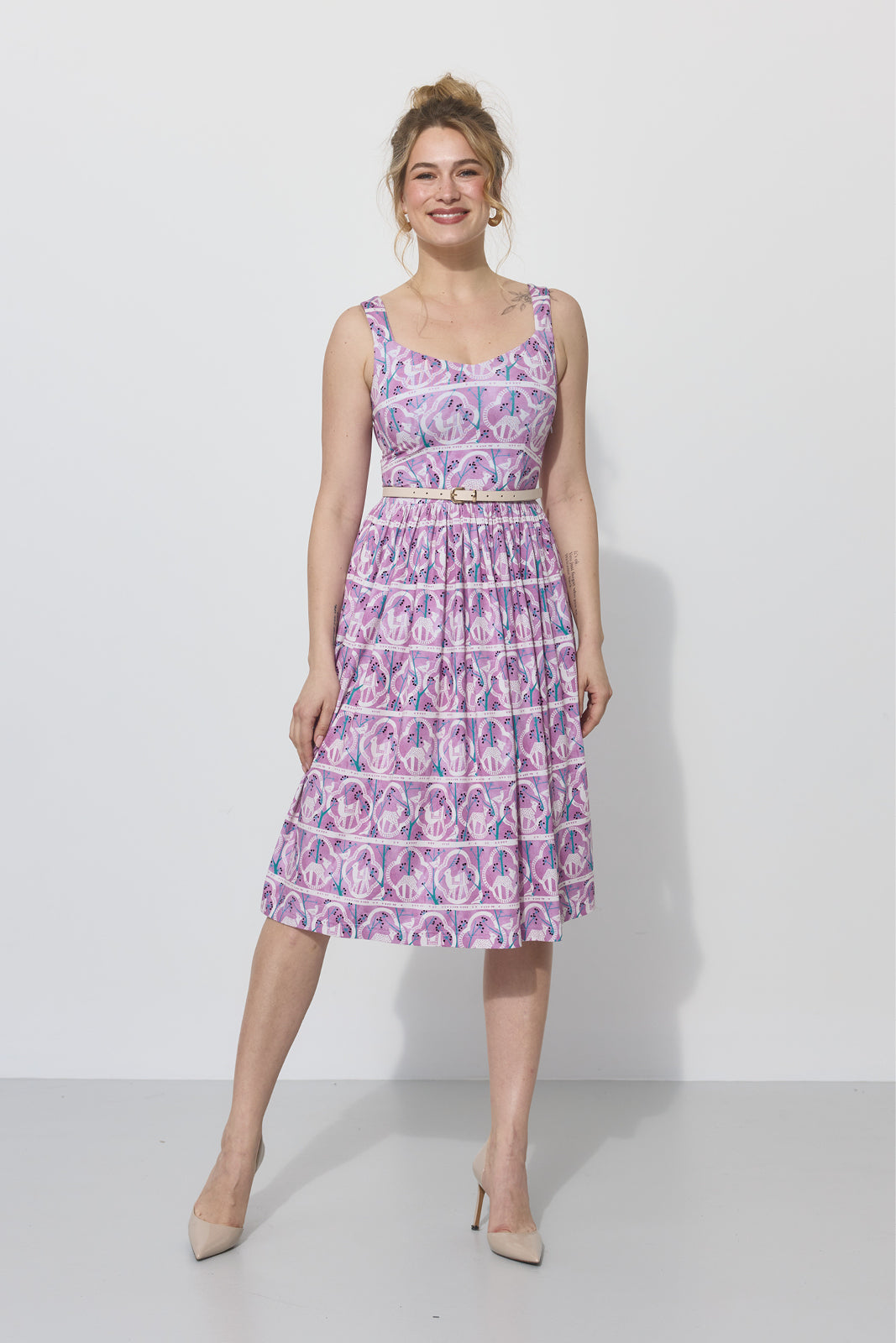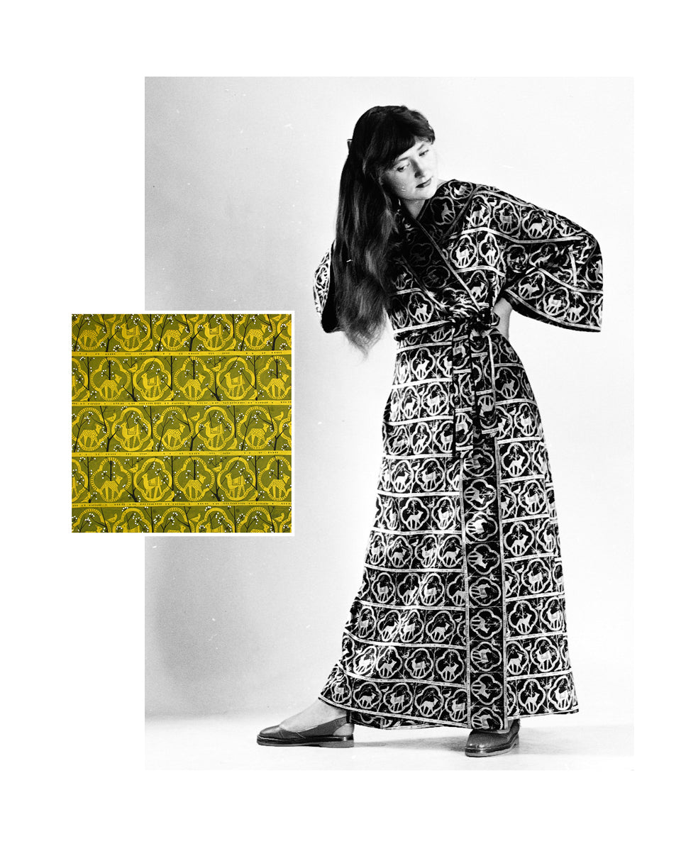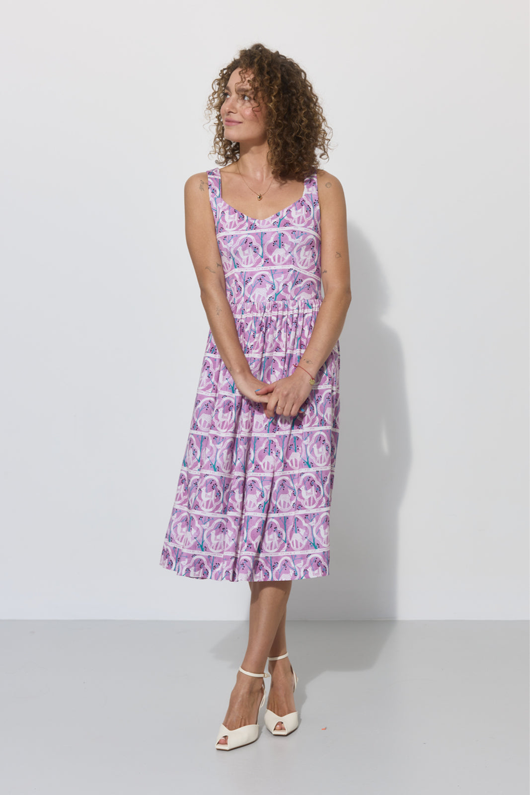 Co za print na niej widzisz? Powstał w 1955 roku. Zaprojektowała go Danuta Paprowicz-Michno dla Instytutu Wzornictwa Przemysłowego, inspirując się wizytą w zoo i rysiami, które wtedy podziwiała z bliska. Po latach znaleźliśmy go w archiwach IWP. Z artystą Marcinem Franczakiem odtworzyliśmy go z małego skrawka materiału i nadaliśmy nowe kolory – takie, które pasują do teraz, rozświetlają cerę i sprawią, że będziesz chciała nosić tę sukienkę non stop.
