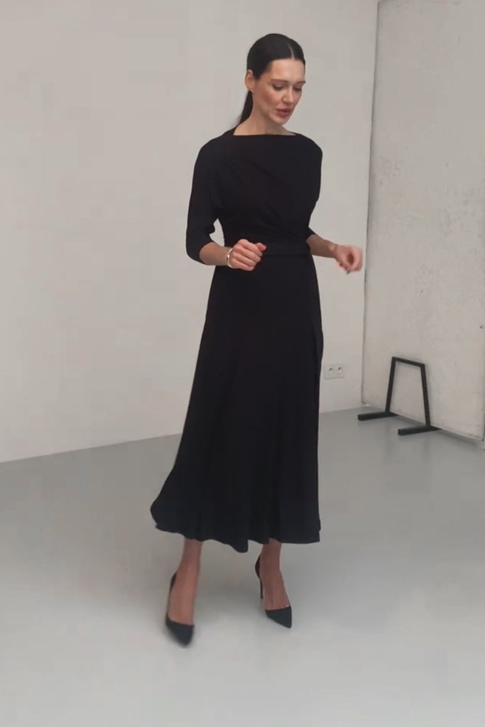 Dzianinowa sukienka, w której wszystko się pięknie układa. Drapowana góra daje dużo luzu i stylu, a skrojony z klinów, rozkloszowany dół pięknie podąża za każdym Twoim ruchem. Żebyś zawsze czuła się w tej sukience swobodnie, ma w talii elastyczną, wygodną gumę, a jeśli chcesz - możesz się dodatkowo przewiązać paskiem. Ma kieszenie!